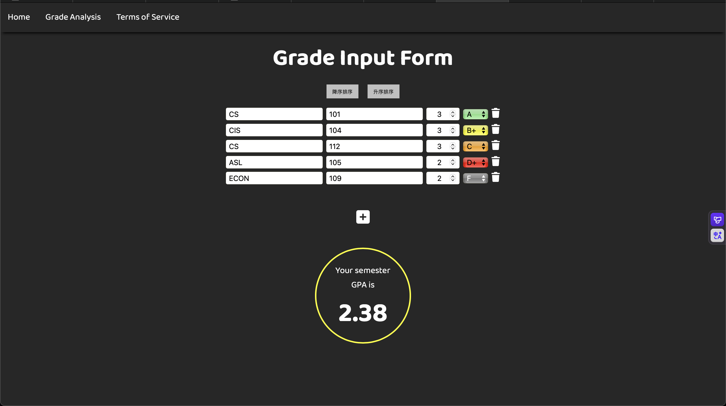 大學生成績計算工具。實作了動態表單增刪功能,並內建 Merge Sort 演算法提供成績排序功能。開場動畫使用 GSAP 製作。