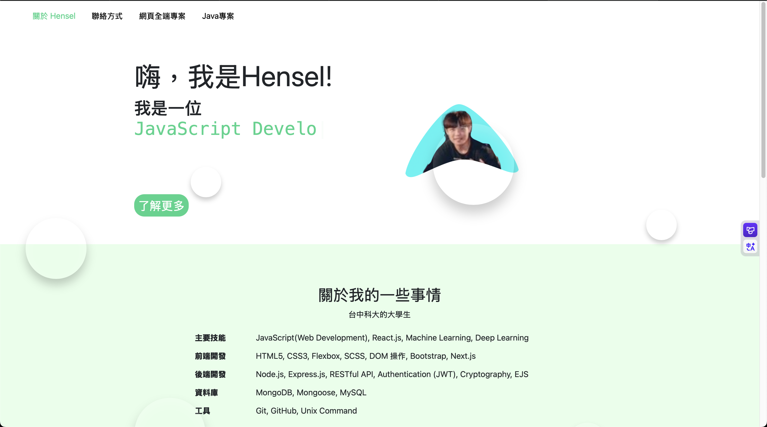 大三時期的作品。練習了 SCSS 變數管理、打字機特效與漢堡選單的實作。背景氣泡動畫使用純 CSS Keyframes 完成。